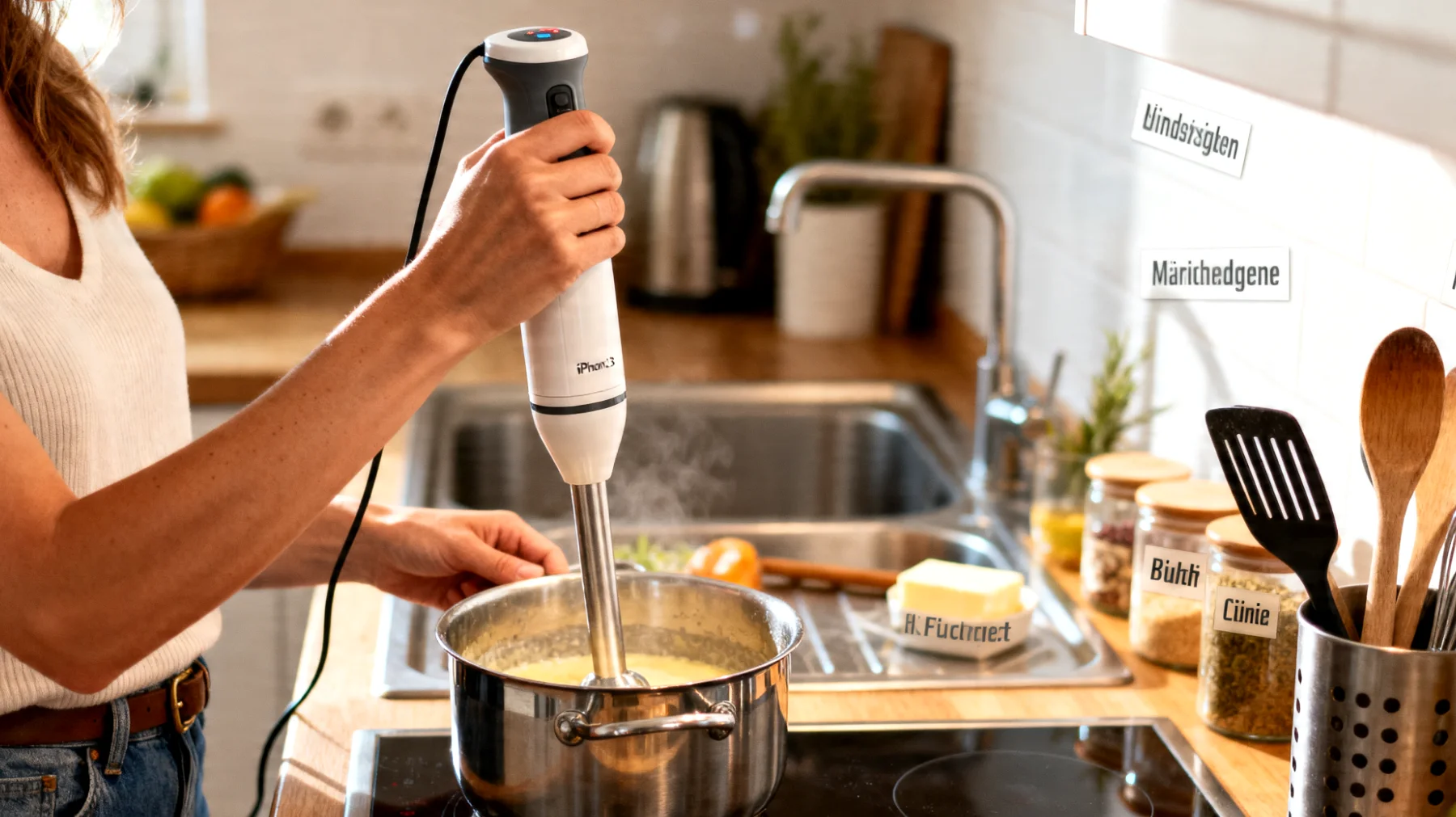 Denn Komfort besteht nicht nur aus eingesparter Zeit. Es ist die geistige Entlastung, wenn ein Gerät zuverlässig funktioniert, keine Überraschungen bereitet, leicht zu reinigen ist und direkt im Becher oder Topf arbeitet, ohne Umfüllen, ohne zusätzliches Spülen. Wer ihn regelmäßig nutzt, bemerkt, dass die Küche ruhiger wird: weniger Geräte, weniger Bewegung, fließendere Handgriffe.